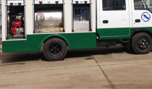 衛(wèi)生防疫車是一種可通過電腦來控制藥物的兌比濃度、并可自動灌裝,攪拌的新型白蟻防治車。其特點(diǎn)是此白蟻防治車上有配藥系統(tǒng),噴藥系統(tǒng),攪拌系統(tǒng)及清洗系統(tǒng)。此車上配有兩個罐體,采用上下疊加式連接,上部罐體為清水箱,下部罐體為配藥箱。在罐體前部另外配有單獨(dú)的藥箱(液體藥物),藥箱上部安裝電腦控制系統(tǒng),后部安裝加藥機(jī),另在整車后部安裝有高壓泵及卷盤。配藥時只需按所需的比例在電腦上輸入所需要的加水量及加藥量即可自動配藥。當(dāng)藥物通過加藥機(jī)輸入到配藥箱后,即可啟動車輛的攪拌系統(tǒng)。另外此車輛還單獨(dú)配有粉狀藥物灌裝到配藥箱的功能,只需將粉狀藥物倒入其單獨(dú)設(shè)置的投料口即可操作配藥。