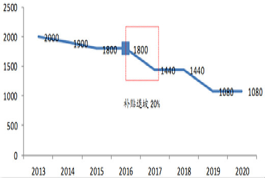 2013 到 2020 年純電動商用車補(bǔ)貼退坡(單位:元/kwh)