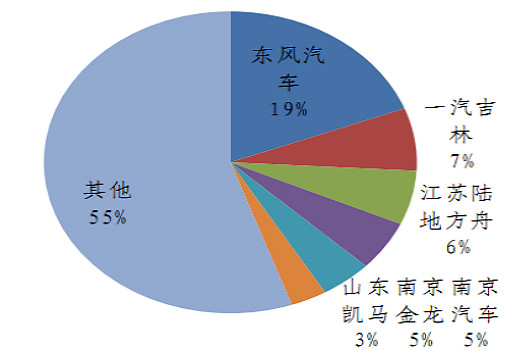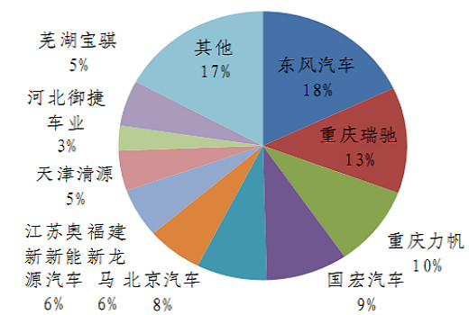 預(yù)計(jì) 8 月份新能源專用車有望進(jìn)入補(bǔ)貼目錄,產(chǎn)量爆發(fā)在即。5 月 24 日工信部公布《道路機(jī)動車輛生產(chǎn)企業(yè)及產(chǎn)品公告》(第 285 批),公告包括了 218 款新能源車。此次車型公告中最受關(guān)注的是 103 款電動專用車,占新能源車型總數(shù)比為 47%,而電動專用車中,電動物流車占比 80%以上。2016 年 6 月 23 日工信部公示《道路機(jī)動車輛生產(chǎn)企業(yè)及產(chǎn)品公告》(第 286 批),包括了 396 款新能源車型,其中新能源專用車155 款。因此,預(yù)計(jì) 8、9 月份第四批《新能源汽車推廣應(yīng)用推薦車型目錄》將出現(xiàn)新能源專用車車型。從 2016 年年初至今,多家電動物流車公司訂單數(shù)已經(jīng)超過 10.32萬輛,一旦新能源物流車進(jìn)入補(bǔ)貼目錄,電動物流車將爆發(fā)增長。其中,東風(fēng)汽車在純電動汽車車型申報(bào)、市場占有率及訂單數(shù)量均遙遙領(lǐng)先。